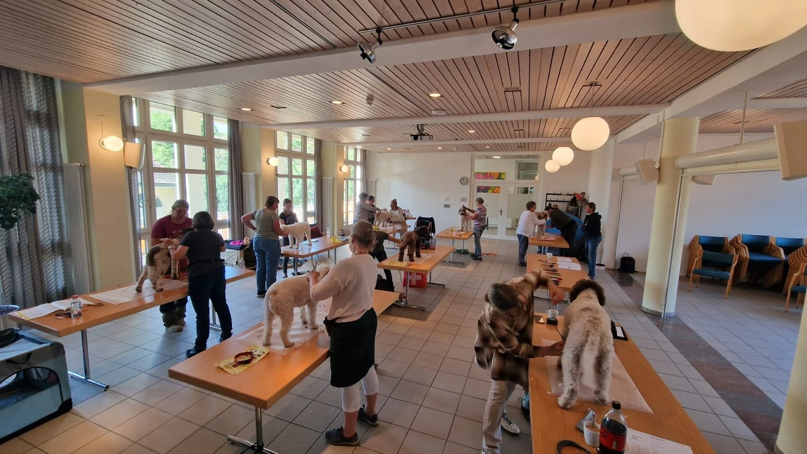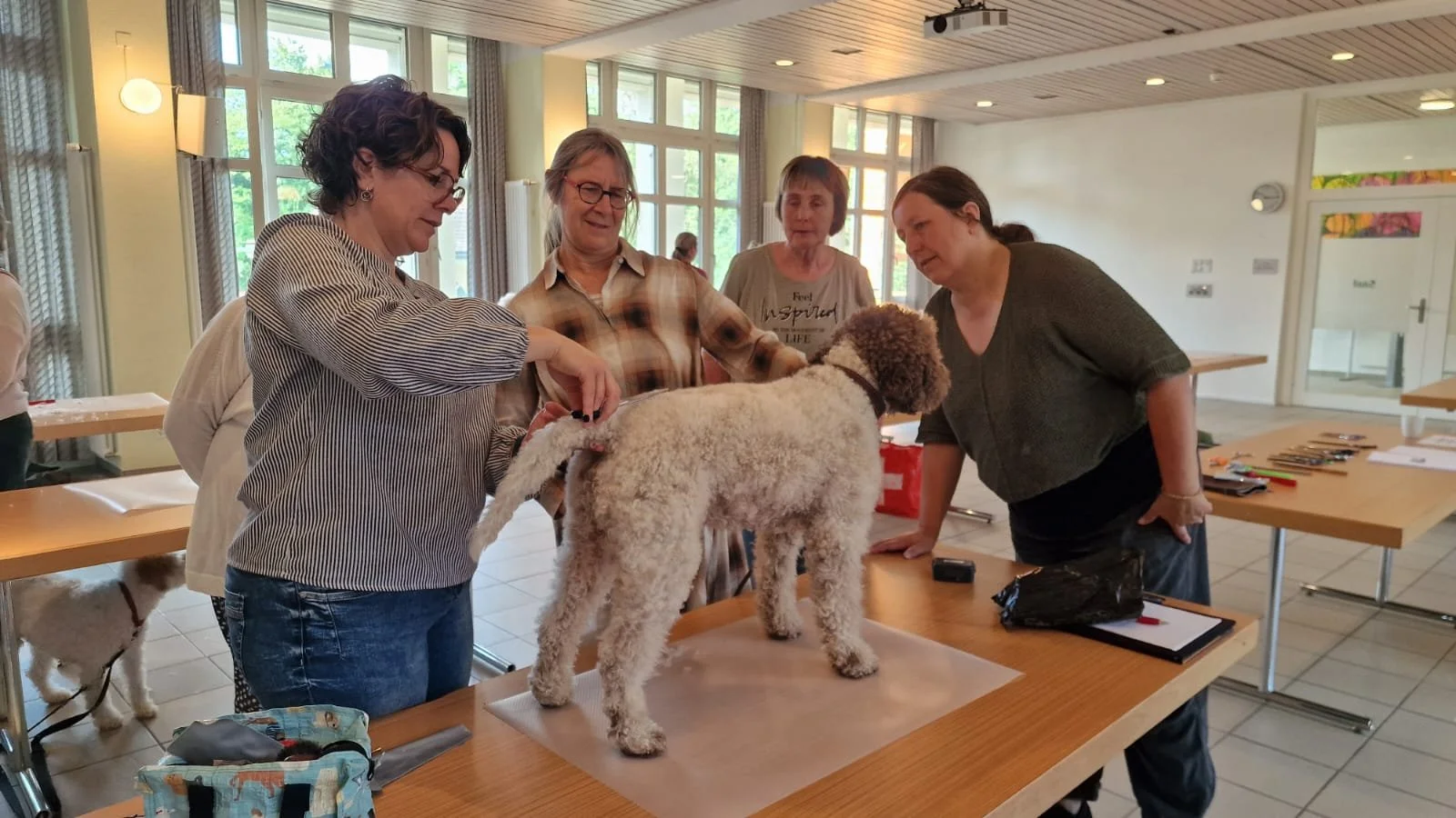 Unter der fachkundigen Leitung von Katrien van Gemert (Lagotto Grooming) erhielten die Teilnehmenden wertvolle Tipps rund um Pflege, Fellstruktur, Werkzeug und Schnitttechniken. Frau van Gemert stellte zudem eine Auswahl an verschiedenen Scheren und Bürsten vor und erklärte deren gezielten Einsatz. Besonders geschätzt wurde die Möglichkeit, das Gelernte gleich praktisch am eigenen Hund umzusetzen.